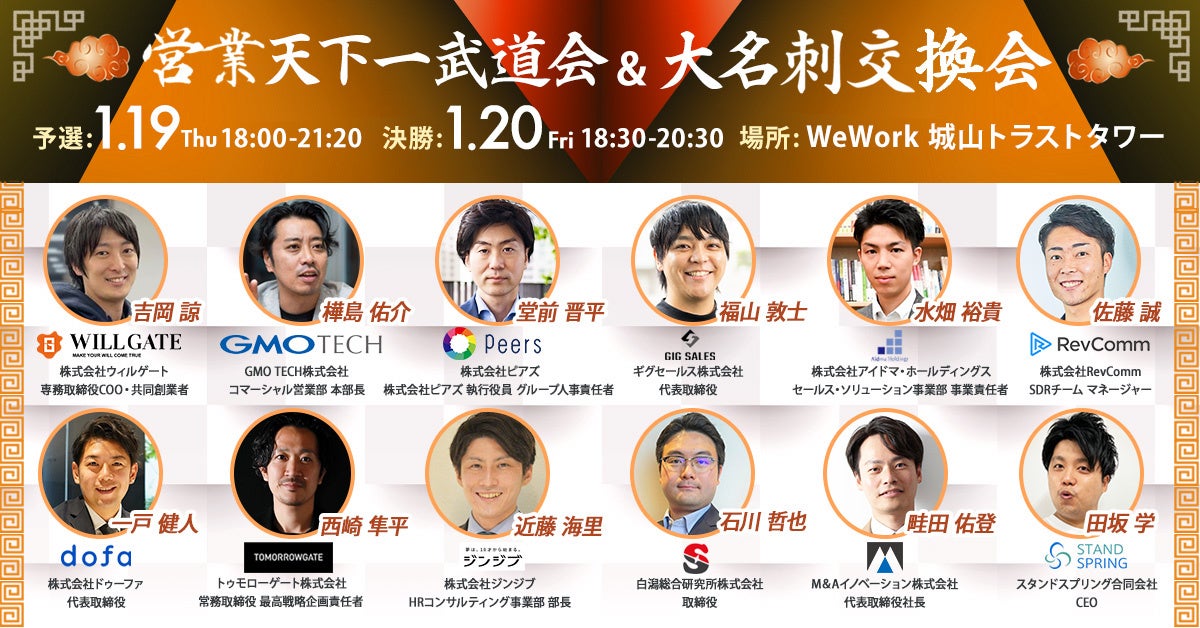 翌週1月19日〜20日に行われるリアルイベントの『営業天下一武道会』では、厳選された国内最高峰レベルの営業の猛者12名の勝ち抜きバトルを行い、営業の日本一を決める戦いをお届け。