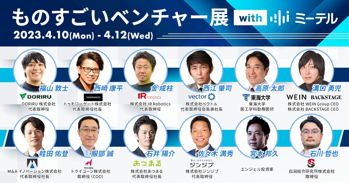 SaaS事業者支援プラットフォーム『kyozon』を運営している、株式会社コミクス(本社:東京都渋⾕区、代表取締役:鈴⽊ 章裕、以下コミクス)は、毎回大盛況だったベンチャー企業にスポットをあてたオンラインイベントを、今回は『ものすごいベンチャー展 with ミーテル』と題して4月10日(月)〜4月12日(水)計3日間開催。翌週4/17(月)にはベストプレゼンターを決めるリアルイベントをオフラインにて開催を決定致しました。